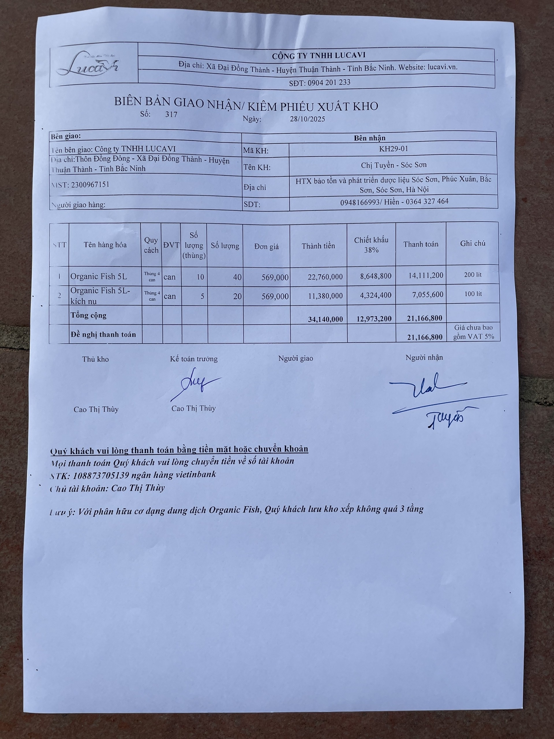 | 28-10-2025 12:10:00 | Phân hữu cơ | Nhập kho phân bón hữu cơ Lucavi. Khu 3 nhập kho 5 thùng phân Organic Fish (Thùng 4 chai 5L) tổng 100 Lít và 3 thùng Organic Fish kích nụ (Thùng 4 chai 5L) tổng 60 Lít. | Hoàn thành | |