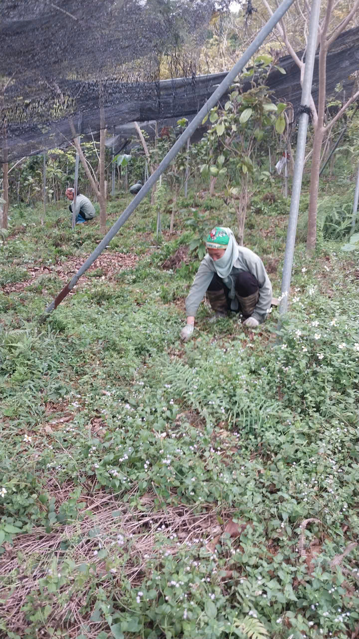 | 01-10-2024 12:10:00 | Làm cỏ | Tiếp tục làm cỏ bằng tay một số khu vực của vườn trà. Dọn sạch cỏ dại, thực bì quanh gốc, đường kính 1m để vườn trà được thông thoáng, hạn chế sâu bệnh hại. | Hoàn thành | |