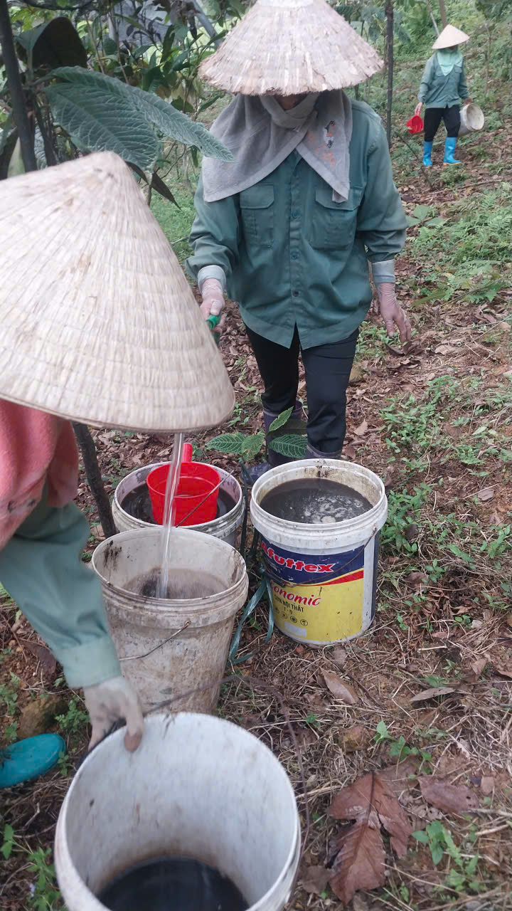 | 14-04-2025 12:04:00 | Bón Thúc | Tiến hành bón phân cho cây Trà Hoa Vàng. Sử dụng phân hữu cơ LUCAVI dạng dung dịch - Lượng bón: • Cây nhỏ: tưới 100ml dung dịch phân bón • Cây nhỡ: tưới 150ml dung dịch phân bón - Cách bón: Tưới gốc quanh gốc trà bằng dung dịch phân bón đậm đặc, sau đó tưới nước để phân ngấm dần vào đất. Tổng dung lượng bón cho toàn bộ vườn trà là 120 lít dung dịch Lucavi. | Hoàn thành | |