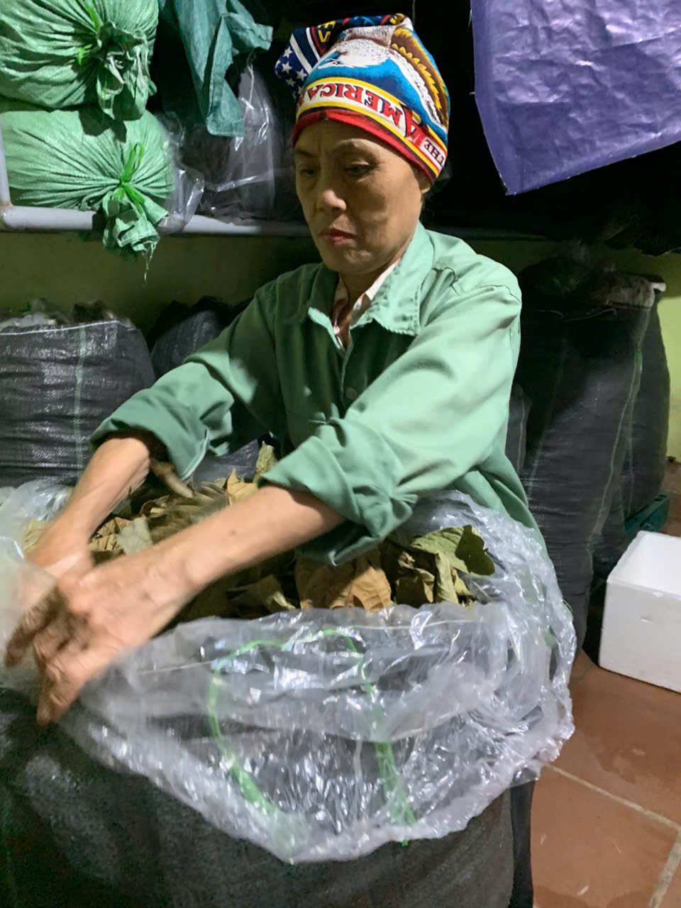 | 18-09-2025 12:09:00 | Nhà kho bảo quản | Nhập kho tổng khối lượng thu hoạch lá Trà hoa vàng sau các đợt thu hoạch là: 19 (Kg). Lá trà được đóng trong bao nilon trong suốt và đựng trong bao tải dứa rồi xếp lên giá riêng biệt trong kho chứa dược liệu. | Hoàn thành | |